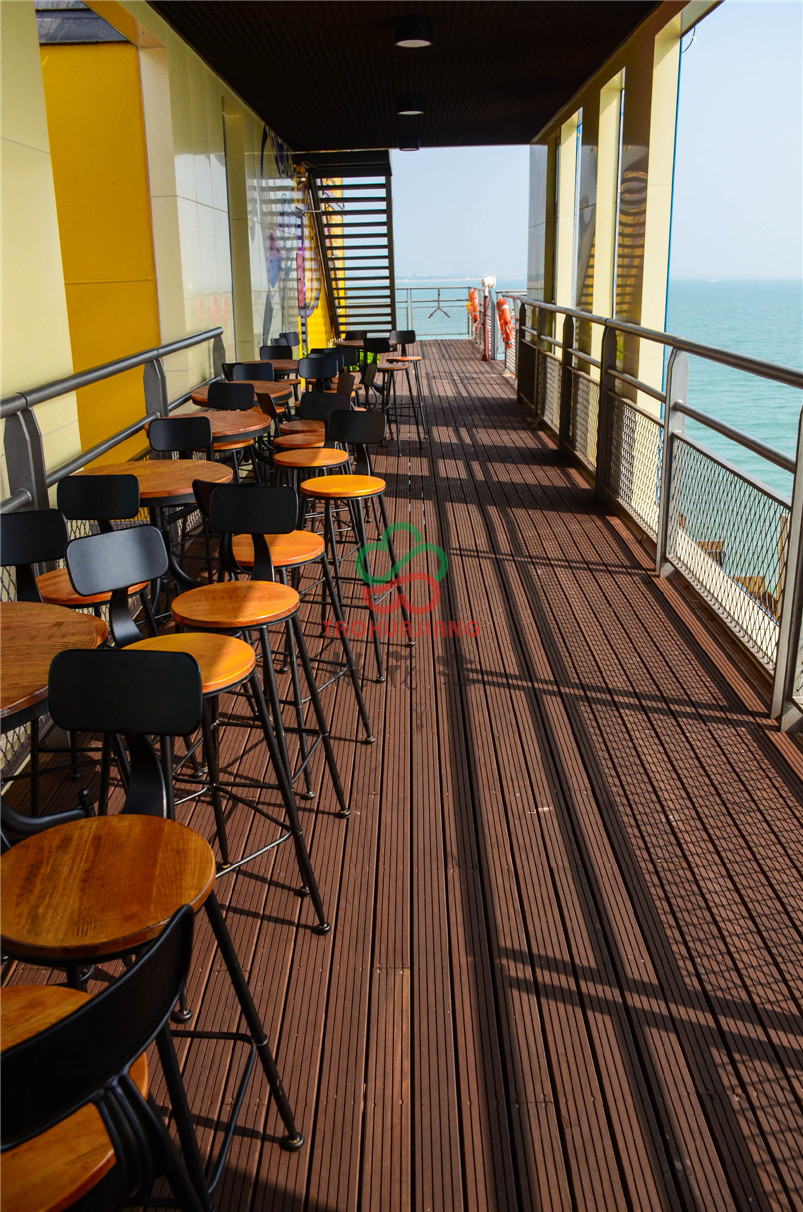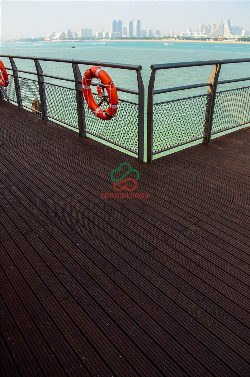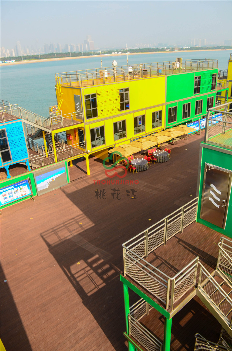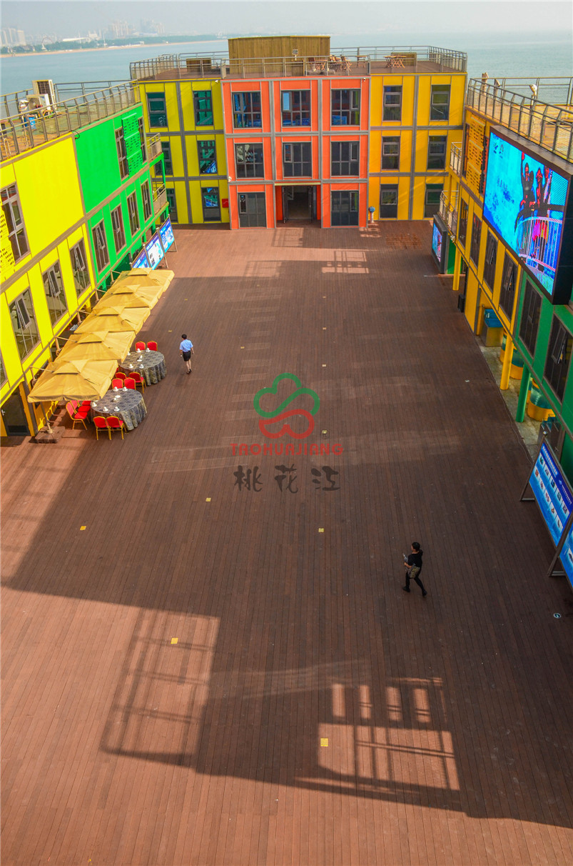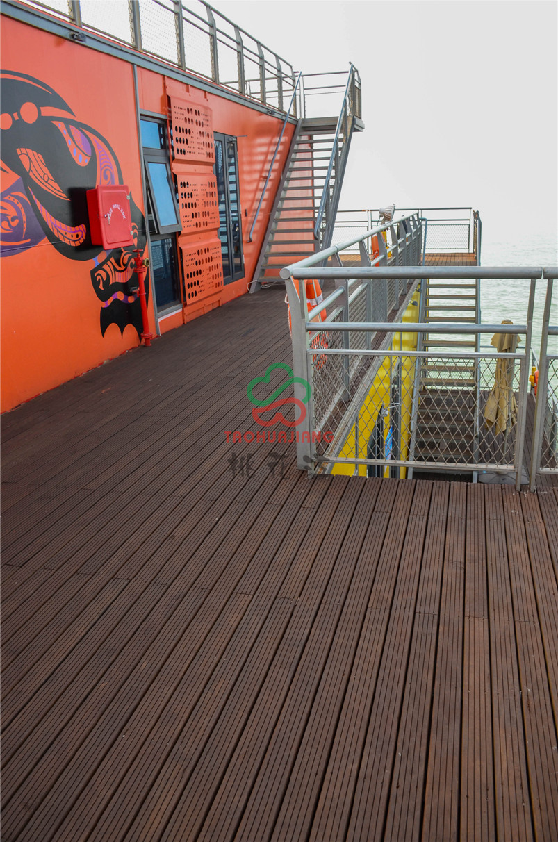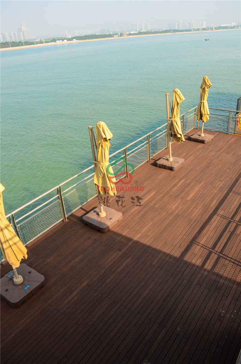 海上牧歌旅游休闲度假平台是按照海上浮岛理念设计,以海洋文化、蓝色畅想为主题,通过游、娱、食、宿、赏、钓、放、赛等多种形式,打造集休闲观光、竞技垂钓、海洋采摘、食宿赏娱功能于一体的海上休闲旅游体验平台。该项目的甲板上全部铺设桃花江竹材科技的户外防腐竹地板,桃花江的户外防腐竹地板以其优异的环保性、耐候性和稳定性,即使在日晒雨淋的甲板上也不动声色,稳定性强,甲板上同时可容纳上千人,深咖色的地板与五彩斑斓的建筑形成一幅绚丽的风景,是人们休闲娱乐观海的极佳所在。