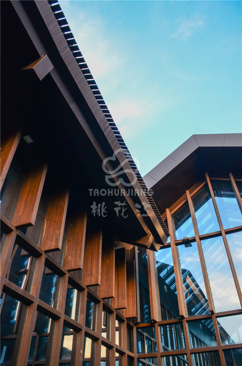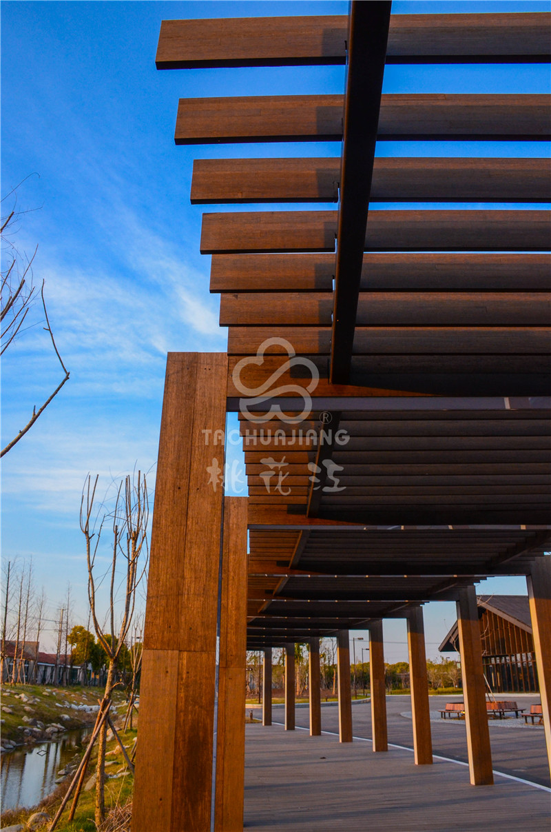海门农副产品会展中心位于江苏南通海门市开发区上海路、黄浦江路交叉口西侧,该展销中心是海门市最大的专业农产品展销中心。该会展中心的立面装饰墙板、景观地板与户外廊架全部采用湖南桃花江竹材科技生产的高炭防腐户外竹材。