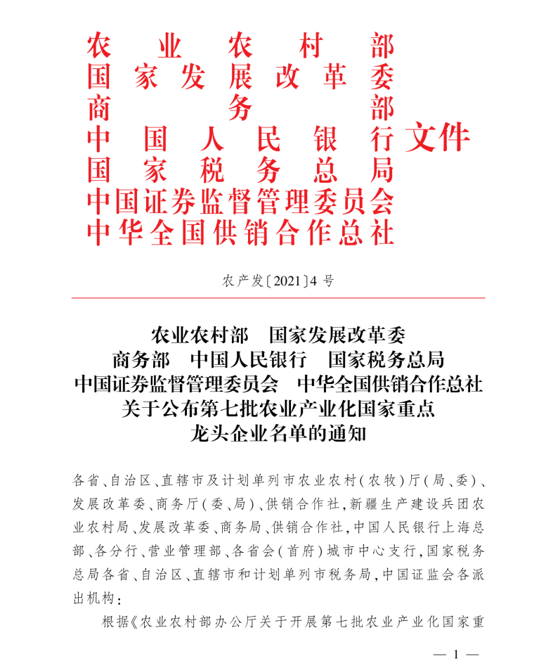 2021年12月30日公布的第七批农业产业化国家重点龙头企业名单中,168极速/赛车/幸运/飞艇官方开奖历史记录成功入选。