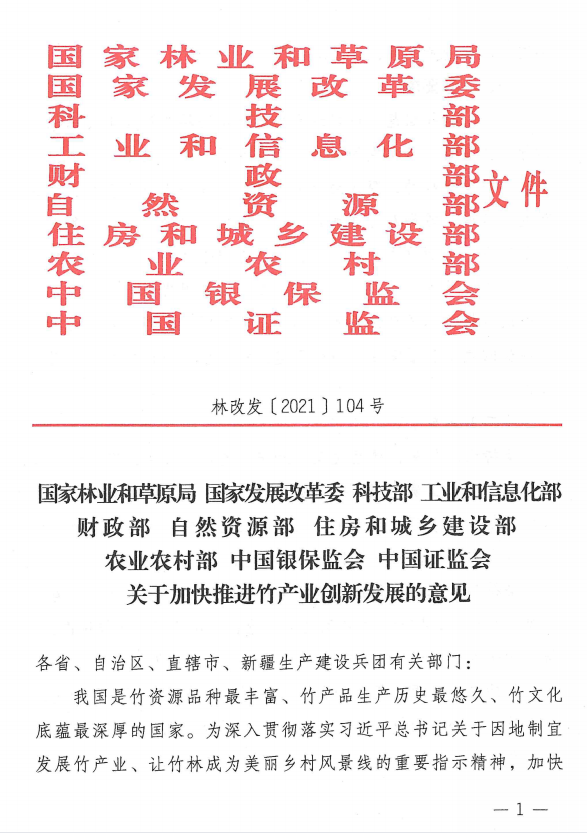 近日,国家林业和草原局、国家发展改革委、科技部、工业和信息化部、财政部、自然资源部、住房和城乡建设部、农业农村部、中国银保监会、中国证监会等10部门联合发布了《关于加快推进竹产业创新发展的意见》(以下简称《意见》)。