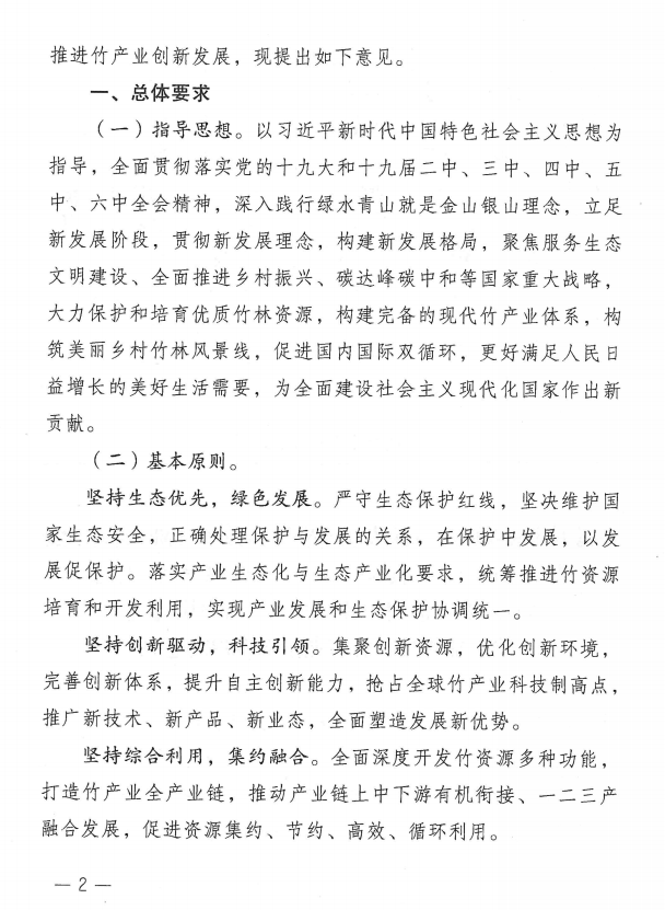 《意见》明确了竹产业创新发展的基本原则,要坚持生态优先,绿色发展;坚持创新驱动,科技引领;坚持综合利用,集约融合;坚持规划先行,规范用地;坚持市场主导,政府引导。