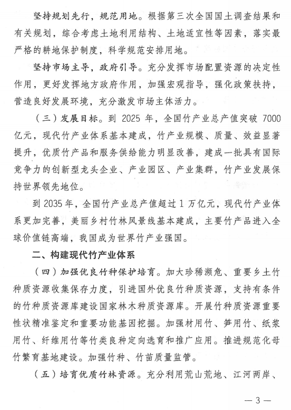 《意见》提出了发展目标,到2025年,全国竹产业总产值突破7000亿元,现代竹产业体系基本建成,竹产业规模、质量、效益显著提升,优质竹产品和服务供给能力明显改善,建成一批具有国际竞争力的创新型龙头企业、产业园区、产业集群,竹产业发展保持世界领先地位;到2035年,全国竹产业总产值超过1万亿元,现代竹产业体系更加完善,美丽乡村竹林风景线基本建成,主要竹产品进入全球价值链高端,我国成为世界竹产业强国。