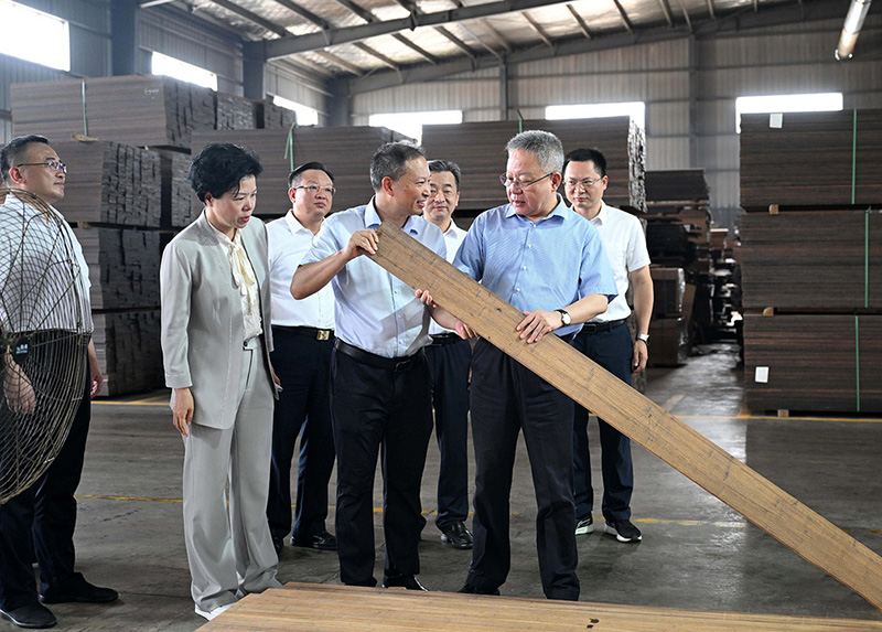 2023年8月8日,湖南省省委书记沈晓明莅临我司考察调研,省委常委张迎春、益阳市市委和桃江县委领导陪同考察。在公司董事长薛志成陪同下,沈晓明书记走进企业生产车间,详细了解竹产品加工、产品创新、市场拓展等情况。桃江县拥有楠竹115万亩,面积居全国第三、湖南第一。沈书记强调要因地制宜发挥自身比较优势,依托楠竹这一宝贵资源,坚持一二三产业融合发展,多维度挖掘竹产业功能,拉长产业链、提高附加值,推动竹产业转型升级。做好竹建筑、竹产品展示文章,弘扬竹文化,做响竹品牌,提升竹产业的知名度和影响力。薛志成董事长对沈书记莅临工厂一线考察调研表示由衷的感谢,他表示公司将充分发挥桃花竹林资源优势,加强研究创新,开发出更多高档竹材产品,为推动竹产业转型升级,提升湖南竹产业的知名度和影响力贡献力量,同时为打造湖南“千亿竹产业”发挥龙头带动和示范作用。